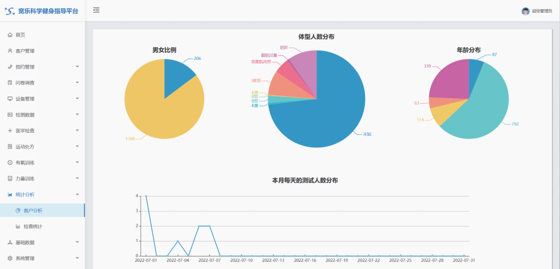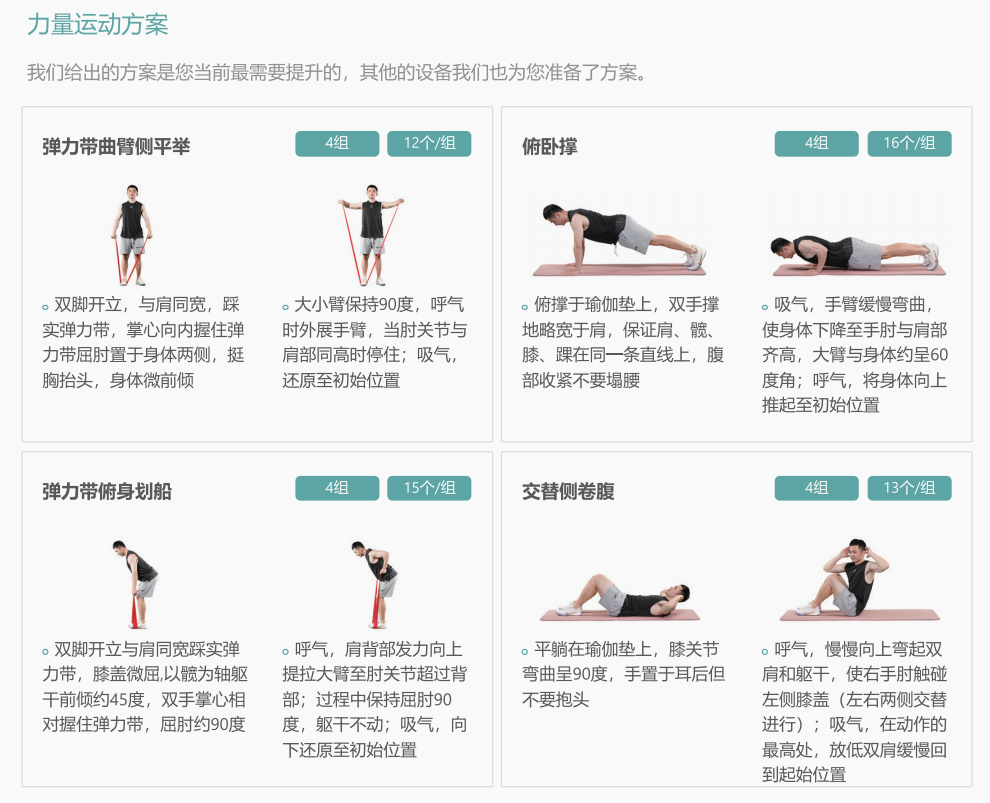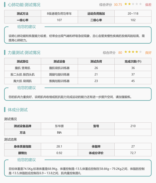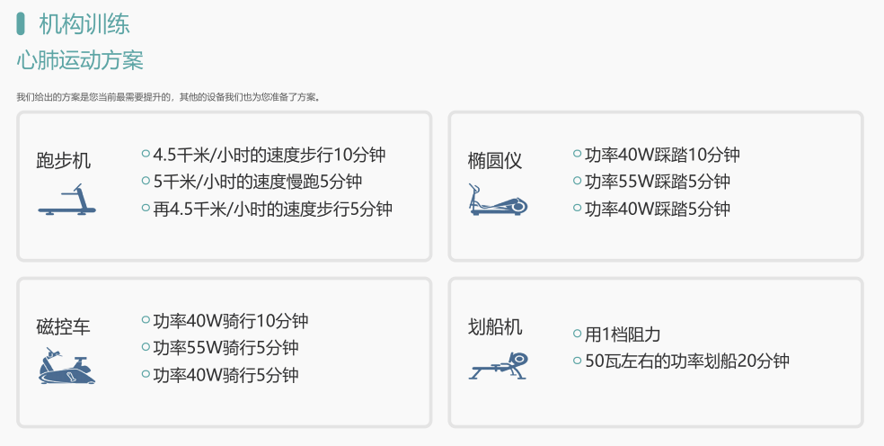 功能模塊包括運(yùn)動(dòng)能力評(píng)估/體適能測(cè)評(píng)(人體成分、心肺功能、肌肉力量等);智能運(yùn)動(dòng)處方(室內(nèi)運(yùn)動(dòng)處方、室外運(yùn)動(dòng)處方);智能運(yùn)動(dòng)干預(yù)(有氧訓(xùn)練、力量訓(xùn)練)和健康管理平臺(tái)。
