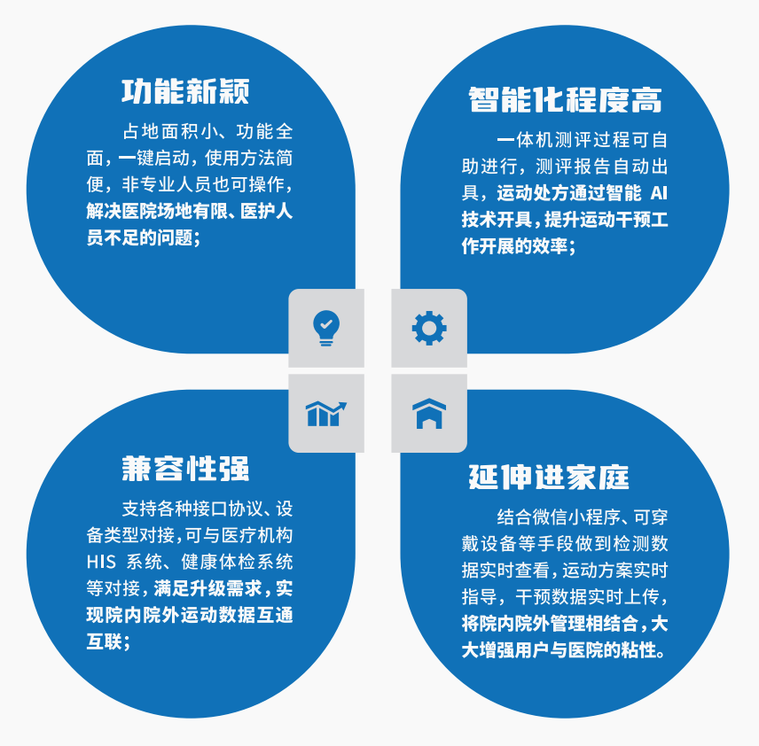 慢病運(yùn)動(dòng)健康管理一體機(jī)將檢測(cè)和干預(yù)設(shè)備整合在溫馨舒適的環(huán)境下,通過軟件系統(tǒng)協(xié)調(diào)工作,使受檢者可以輕松愉悅地開展測(cè)試。通過互聯(lián)網(wǎng)、大數(shù)據(jù)、5G、人工智能等技術(shù)為高血壓、糖尿病等慢病人群開具個(gè)性化運(yùn)動(dòng)處方并進(jìn)行日常運(yùn)動(dòng)干預(yù)管理。