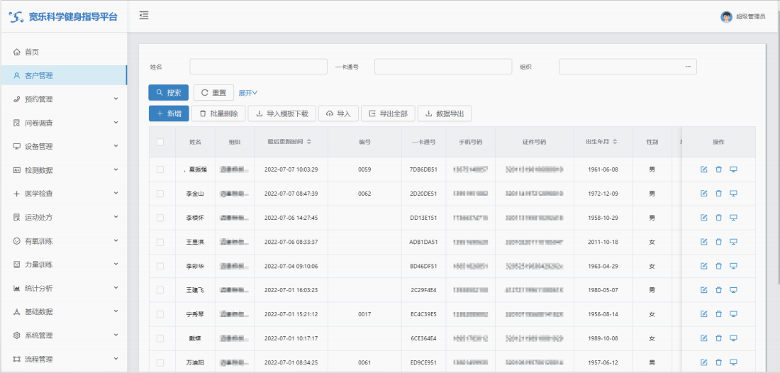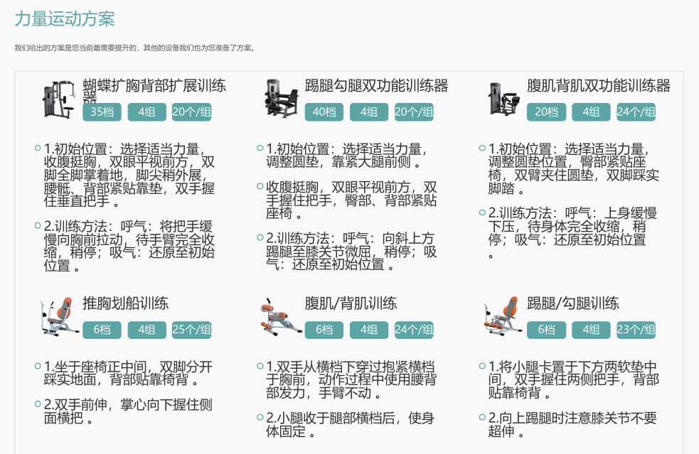 功能模塊包括運(yùn)動(dòng)能力評(píng)估/體適能測(cè)評(píng)(人體成分、心肺功能、肌肉力量等);智能運(yùn)動(dòng)處方(室內(nèi)運(yùn)動(dòng)處方、室外運(yùn)動(dòng)處方);智能運(yùn)動(dòng)干預(yù)(有氧訓(xùn)練、力量訓(xùn)練)和健康管理平臺(tái)。