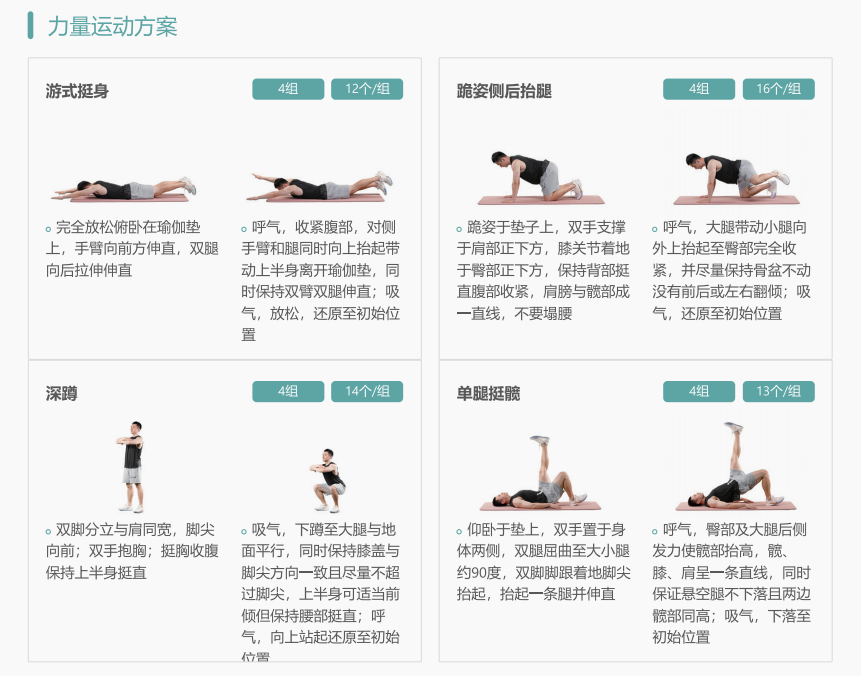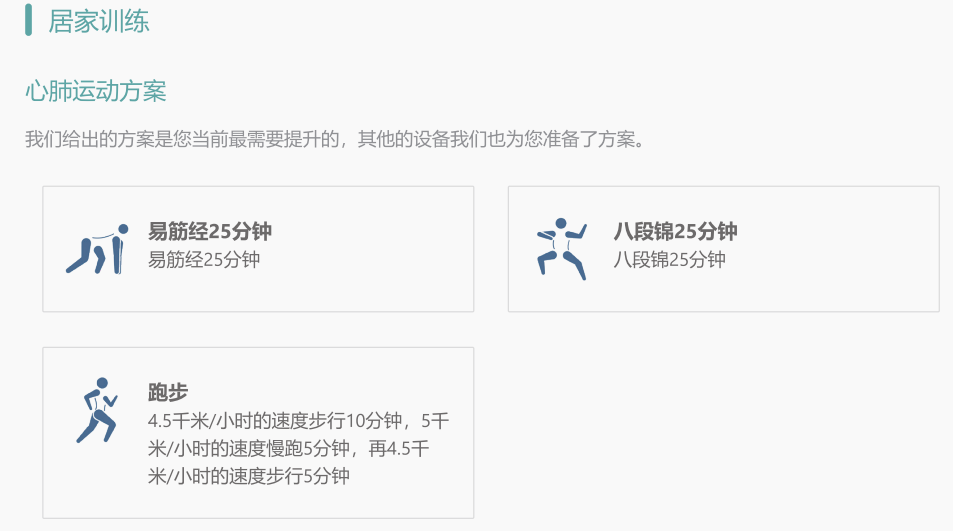 針對(duì)個(gè)人測(cè)評(píng)數(shù)據(jù),智能出具個(gè)性化運(yùn)動(dòng)干預(yù)處方,包含室內(nèi)運(yùn)動(dòng)處方及室外運(yùn)動(dòng)處方,內(nèi)容含訓(xùn)練項(xiàng)目、訓(xùn)練時(shí)間、訓(xùn)練頻率、訓(xùn)練強(qiáng)度等指標(biāo)。運(yùn)動(dòng)處方智能生成模塊支持管理人員在線編輯、簽發(fā)和更改,系統(tǒng)支持智能運(yùn)動(dòng)干預(yù)教育和指導(dǎo)。