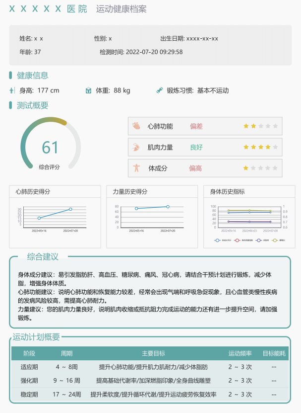 在醫(yī)生工作站查閱個(gè)人運(yùn)動(dòng)健康檔案以及個(gè)人體適能測(cè)評(píng)數(shù)據(jù)、運(yùn)動(dòng)處方、運(yùn)動(dòng)干預(yù)數(shù)據(jù)等,并可一鍵打印生成個(gè)人體適能測(cè)評(píng)報(bào)告。